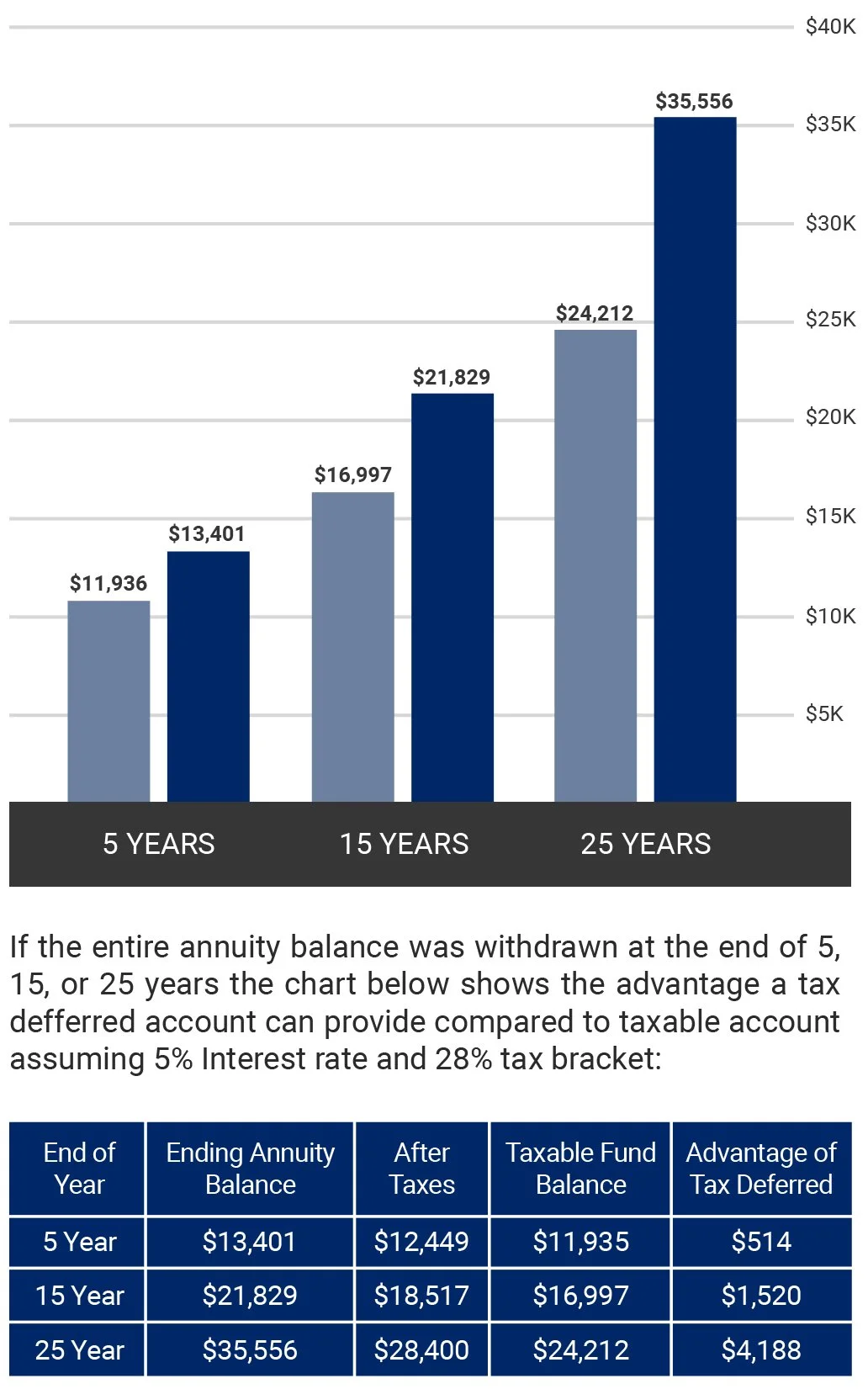 Tax Deferral is a powerful tool used to accumulate cash. You will not pay any taxes on your earnings until you withdraw your funds. This allows you to accumulate interest on funds that you may of otherwise had to pay in taxes. Most people can reduce the amount of taxes paid on the interest accumulated due to being in a lower tax bracket during their retirement years.