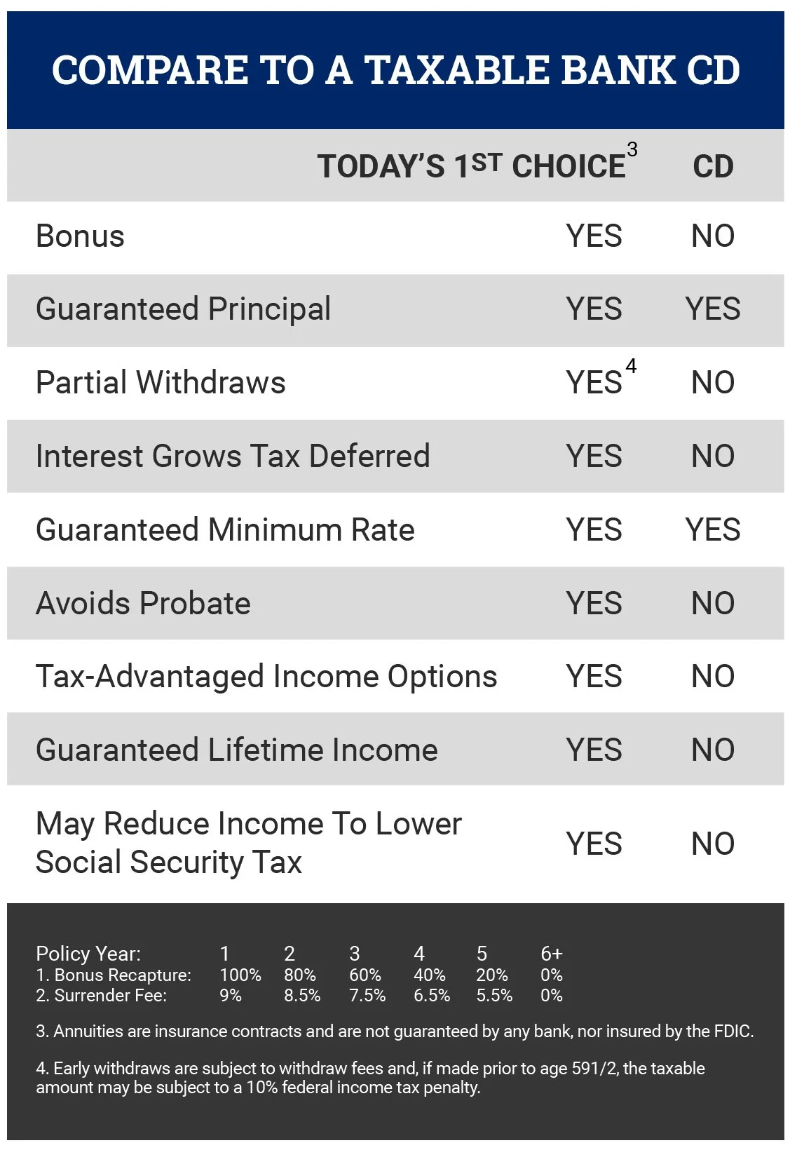 Free 10% withdrawal from your contract beginning in the first year.
